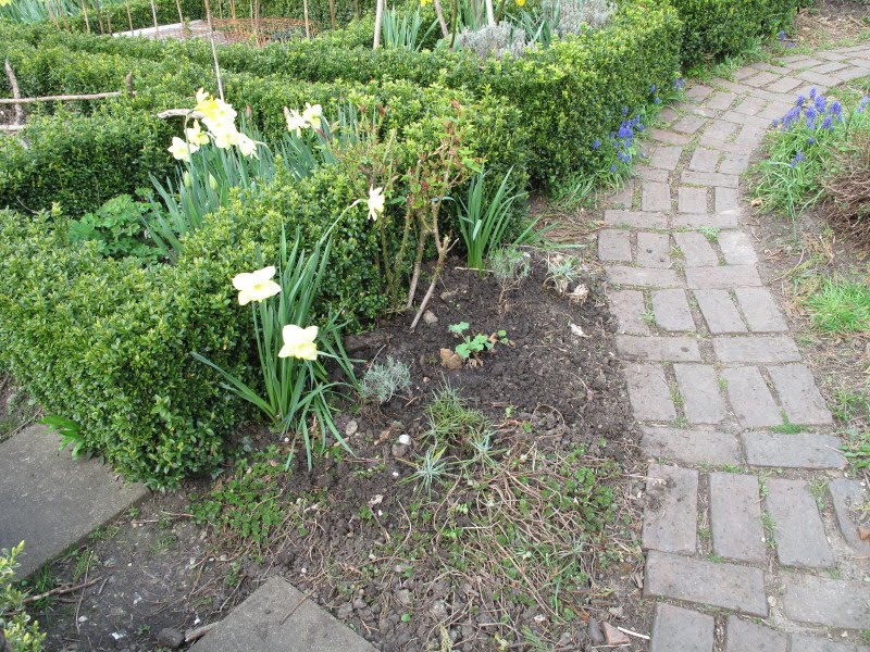 The Bay trees survived the snow and the new rose Sophie's rose was planted in a cardboard box in the centre. This is a useful tip when planting roses in the same place as ones that have been previously growing. I find an A4 box the perfect size.